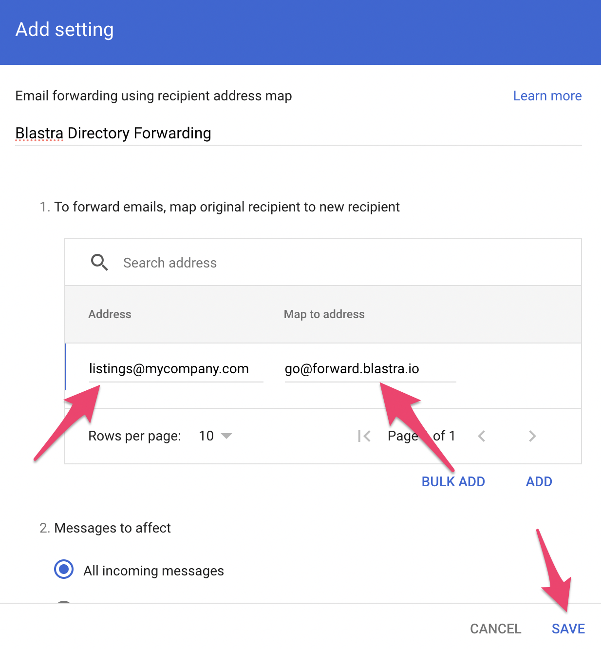 listings@mycompany.com. On the right, entergo@forward.blastra.io. Then hit SAVE at the bottom.